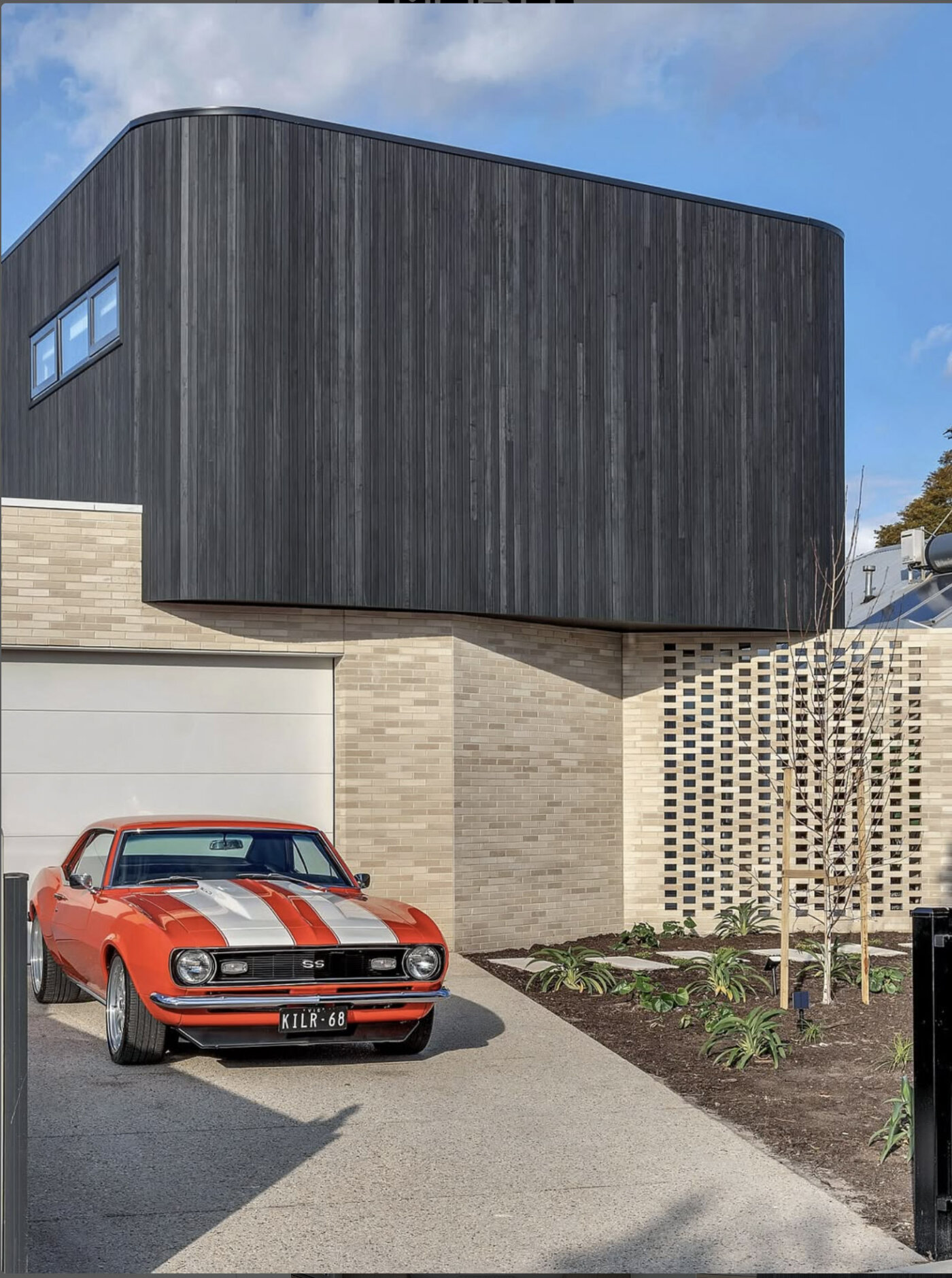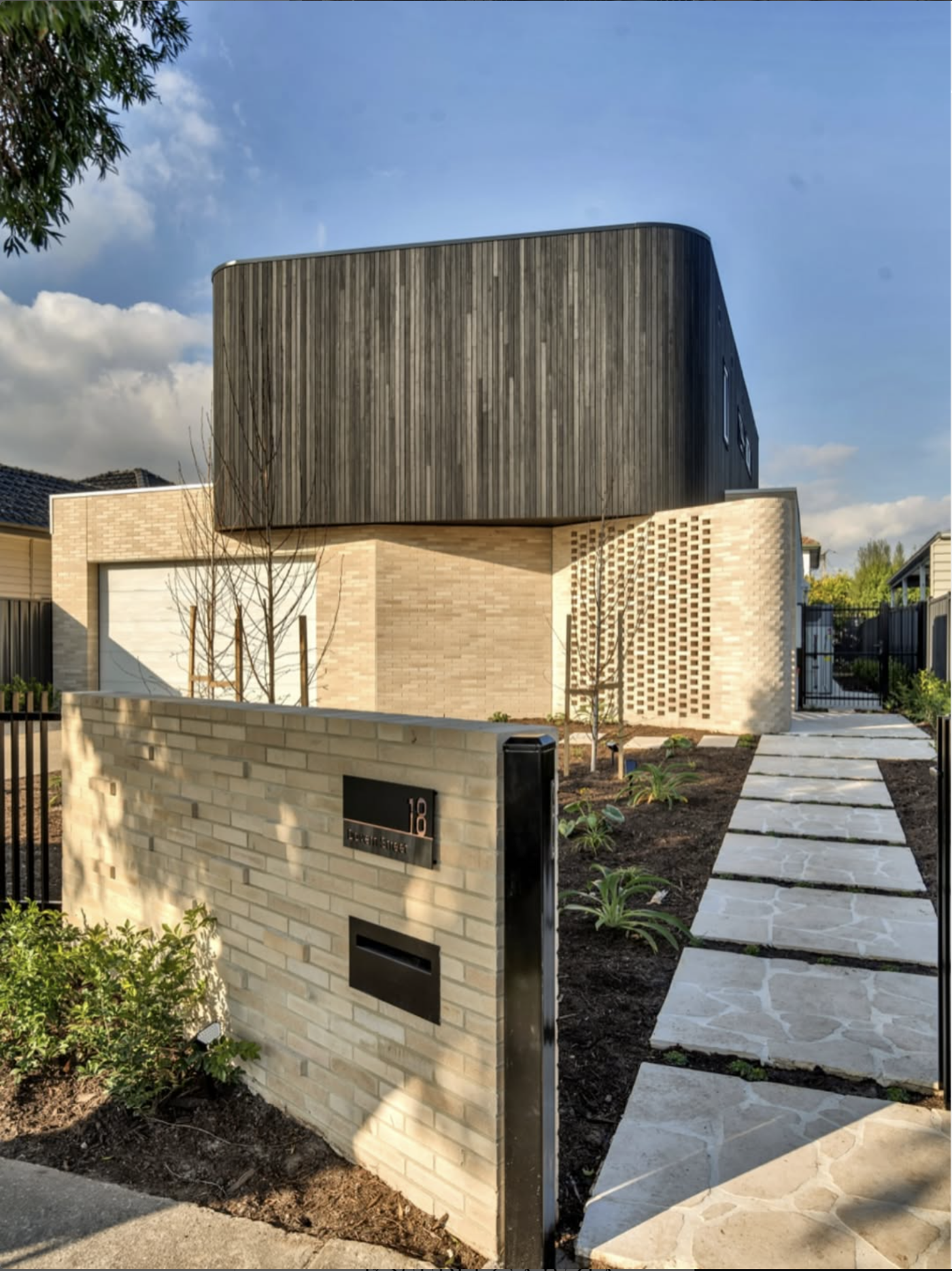 Sho Sugi Ban black charred timber cladding with Equisol Pro E365 oil and black colour tone creates a real design statement in this creative home design in Pasco Vale South, Victoria. A beautiful example of colour, texture and shape contrast with black curved vertical cladding offset by angled pale brickwork.