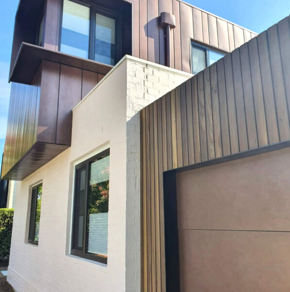 Smartdeck’s Thermo-Ayous thermally modified timber in shadow gap cladding creates a stylish vertical cladding profile for this home. Pre-oiled in Equisol Medium Brown colour tone before construction.